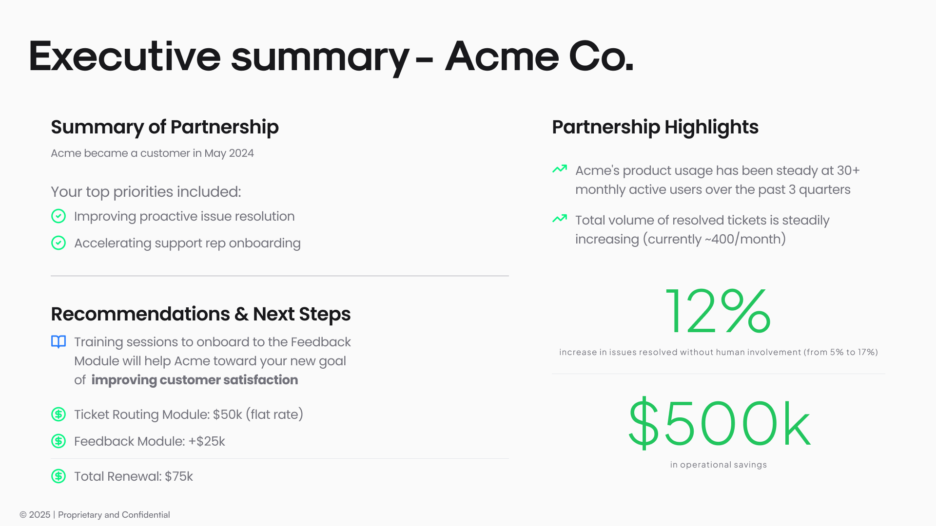 Executive summary recapping your value proposition and renewal recommendation
